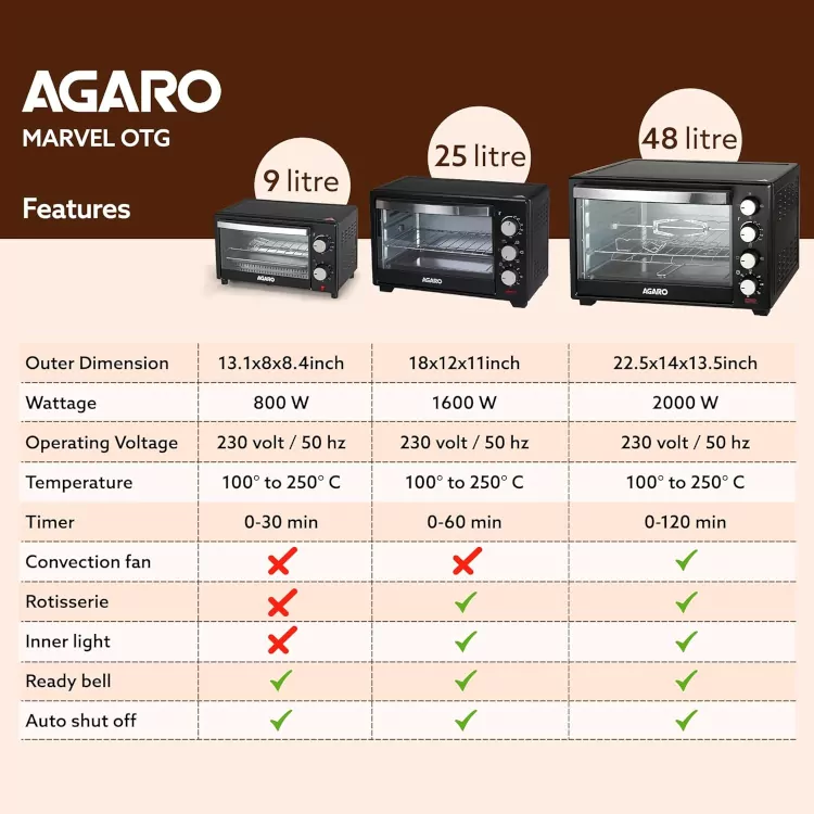 AGARO Marvel 9L OTG Oven 800W, Compact Toaster Griller for Baking, Toasting & Grilling