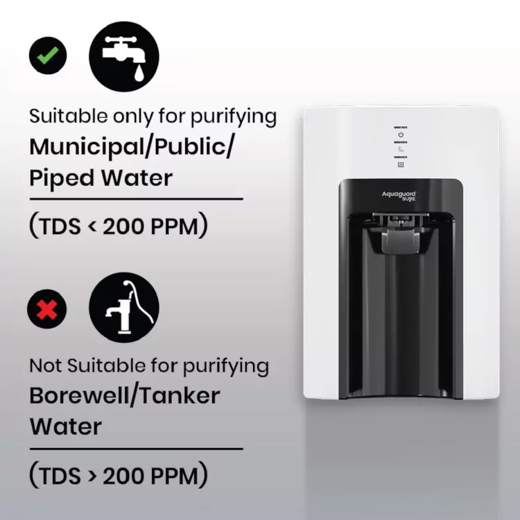- Works with Municipal Water Only– Purifies municipal/ soft water having TDS <200 ppm. Not suitable for borewell and tanker water (TDS >200 ppm)