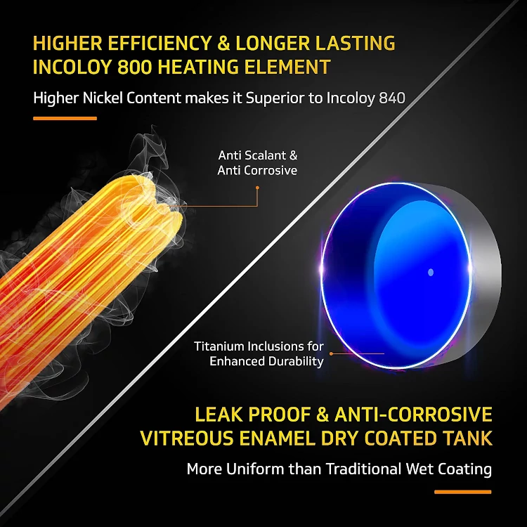 - 【ANTI-CORROSIVE & SUITABLE FOR HARD WATER USAGE】: Advanced Vitreous Enamel Coating protects the Inner Tank, Superior Incoloy 800 Heating Element ensures Sustained Performance, Extra Thick Magnesium Anode provides Added Protection